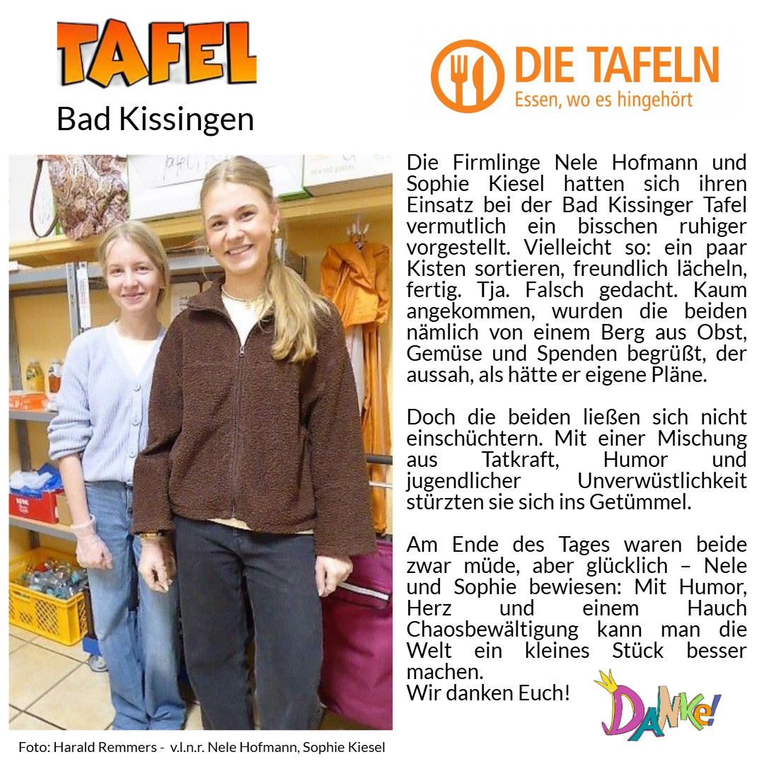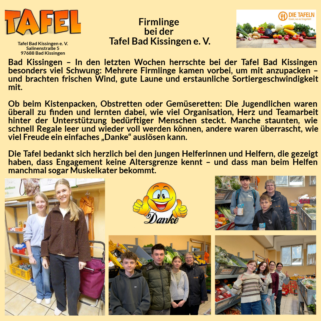Seit über 20 Jahren ist die Tafel Bad Kissingen ein fester Bestandteil der Region. Die Tafel Bad Kissingen versorgt im Landkreis Bad Kissingen ca. 700 Personen wöchentlich mit Lebensmitteln und leistet damit einen wichtigen Beitrag für diejenigen, die Unterstützung brauchen. In Bad Kissingen sind von den bedürftigen Personen etwa 30 % Kinder und Jugendliche.